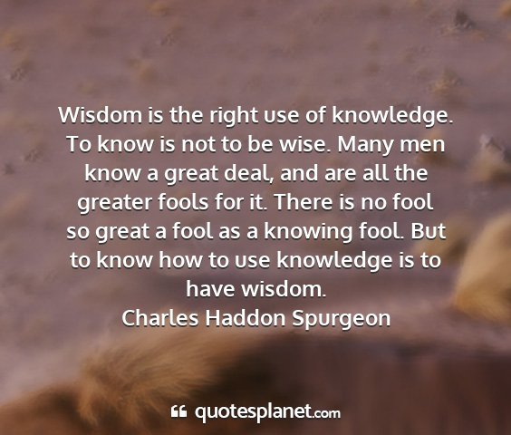 Wisdom is the right use of knowledge. To know is not to be wise. Many men know a great deal, and are all the greater fools for it. There is no fool so great a fool as a knowing fool. But to know how to use knowledge is to have wisdom.Charles Haddon Spurgeon