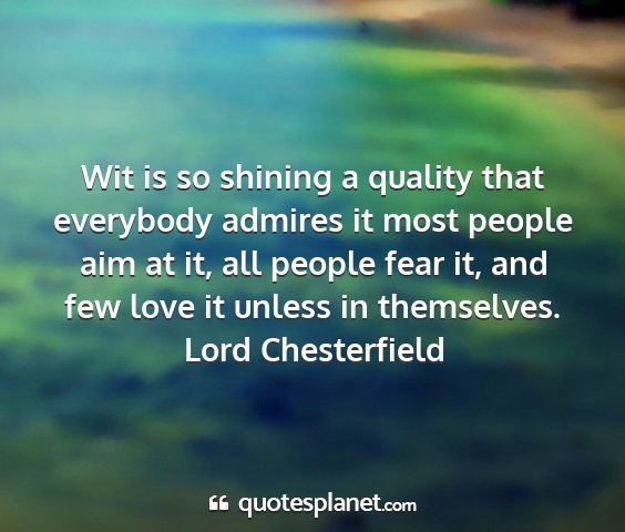 Wit is so shining a quality that everybody admires it most people aim at it, all people fear it, and few love it unless in themselves.Lord Chesterfield