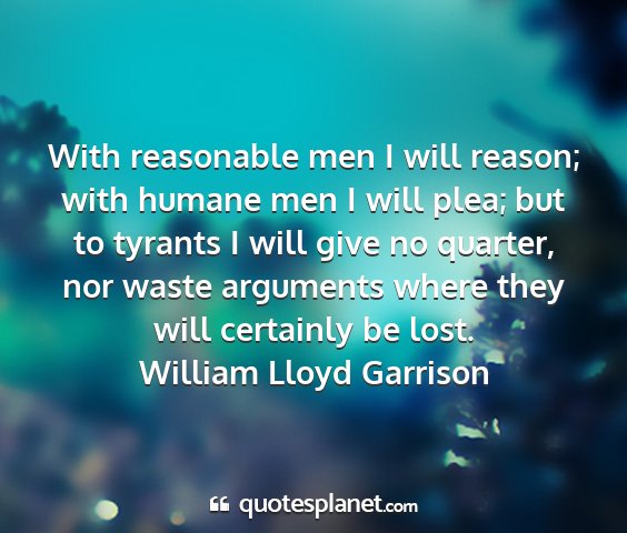 With reasonable men I will reason; with humane men I will plea; but to tyrants I will give no quarter, nor waste arguments where they will certainly be lost.William Lloyd Garrison