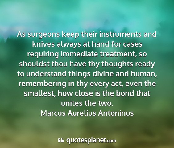 As surgeons keep their instruments and knives always at hand for cases requiring immediate treatment, so shouldst thou have thy thoughts ready to understand things divine and human, remembering in thy every act, even the smallest, how close is the bond that unites the two.Marcus Aurelius Antoninus