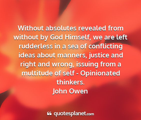 Without absolutes revealed from without by God Himself, we are left rudderless in a sea of conflicting ideas about manners, justice and right and wrong, issuing from a multitude of self - Opinionated thinkers.John Owen