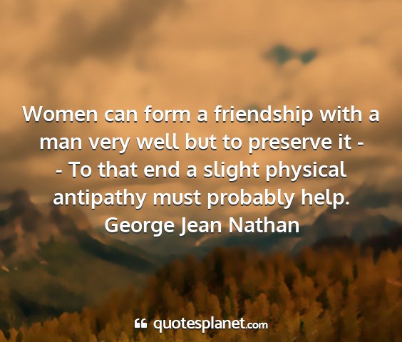 Women can form a friendship with a man very well but to preserve it - - To that end a slight physical antipathy must probably help.George Jean Nathan
