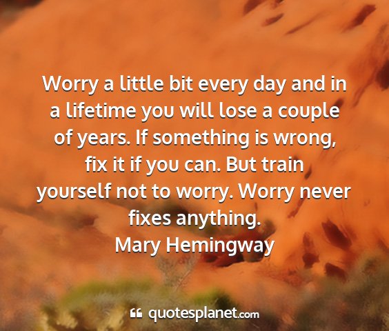 Worry a little bit every day and in a lifetime you will lose a couple of years. If something is wrong, fix it if you can. But train yourself not to worry. Worry never fixes anything.Mary Hemingway