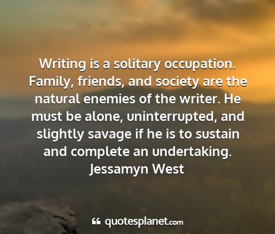 Writing is a solitary occupation. Family, friends, and society are the natural enemies of the writer. He must be alone, uninterrupted, and slightly savage if he is to sustain and complete an undertaking.Jessamyn West