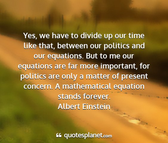 Yes, we have to divide up our time like that, between our politics and our equations. But to me our equations are far more important, for politics are only a matter of present concern. A mathematical equation stands forever.Albert Einstein