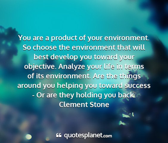 You are a product of your environment. So choose the environment that will best develop you toward your objective. Analyze your life in terms of its environment. Are the things around you helping you toward success - Or are they holding you back.Clement Stone