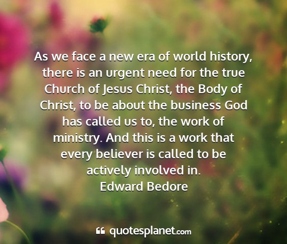As we face a new era of world history, there is an urgent need for the true Church of Jesus Christ, the Body of Christ, to be about the business God has called us to, the work of ministry. And this is a work that every believer is called to be actively involved in.Edward Bedore