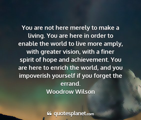 You are not here merely to make a living. You are here in order to enable the world to live more amply, with greater vision, with a finer spirit of hope and achievement. You are here to enrich the world, and you impoverish yourself if you forget the errand.Woodrow Wilson