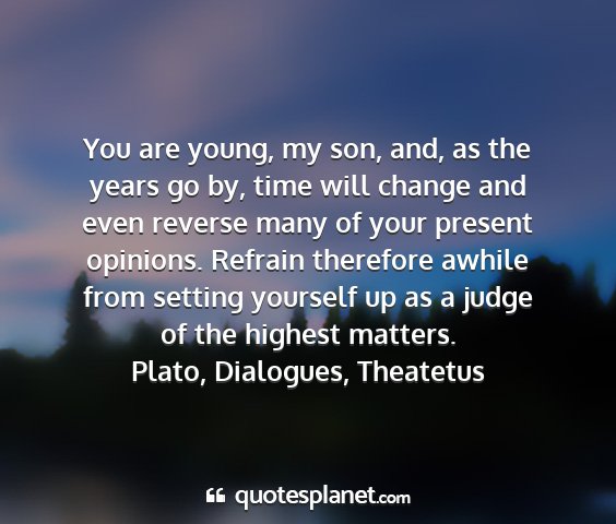 You are young, my son, and, as the years go by, time will change and even reverse many of your present opinions. Refrain therefore awhile from setting yourself up as a judge of the highest matters.Plato, Dialogues, Theatetus