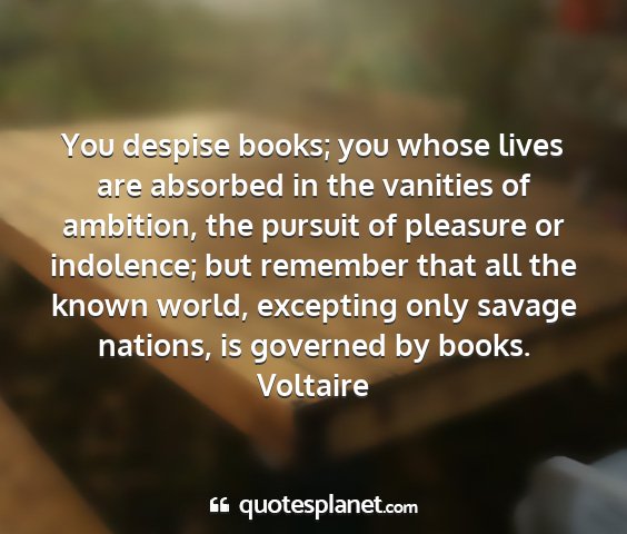 You despise books; you whose lives are absorbed in the vanities of ambition, the pursuit of pleasure or indolence; but remember that all the known world, excepting only savage nations, is governed by books.Voltaire