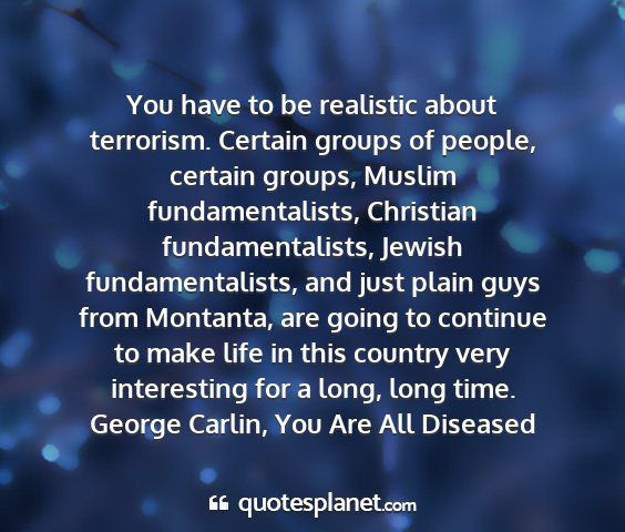 You have to be realistic about terrorism. Certain groups of people, certain groups, Muslim fundamentalists, Christian fundamentalists, Jewish fundamentalists, and just plain guys from Montanta, are going to continue to make life in this country very interesting for a long, long time.George Carlin, You Are All Diseased