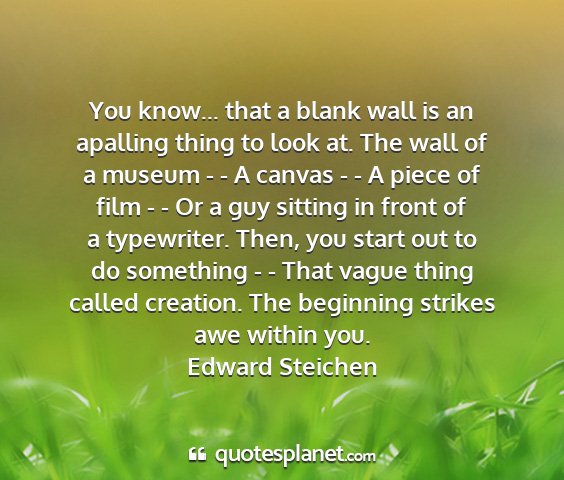 You know... that a blank wall is an apalling thing to look at. The wall of a museum - - A canvas - - A piece of film - - Or a guy sitting in front of a typewriter. Then, you start out to do something - - That vague thing called creation. The beginning strikes awe within you.