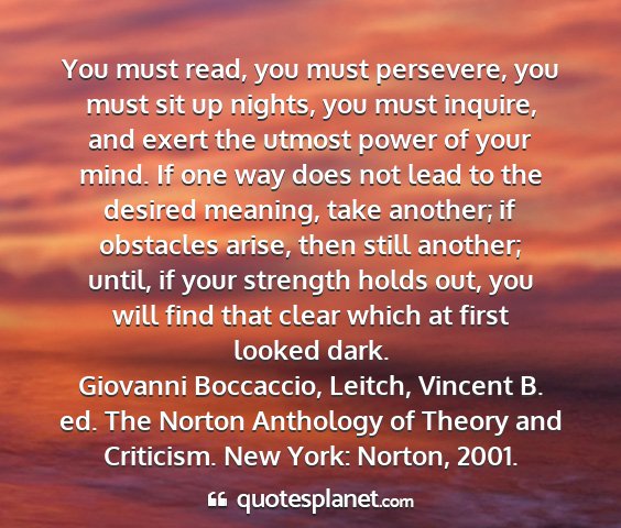 You must read, you must persevere, you must sit up nights, you must inquire, and exert the utmost power of your mind. If one way does not lead to the desired meaning, take another; if obstacles arise, then still another; until, if your strength holds out, you will find that clear which at first looked dark.Giovanni Boccaccio, Leitch, Vincent B. ed. The Norton Anthology of Theory and Criticism. New York: Norton, 2001.