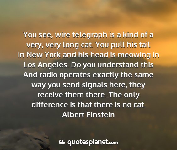 You see, wire telegraph is a kind of a very, very long cat. You pull his tail in New York and his head is meowing in Los Angeles. Do you understand this And radio operates exactly the same way you send signals here, they receive them there. The only difference is that there is no cat.Albert Einstein