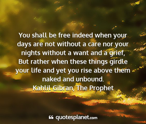 You shall be free indeed when your days are not without a care nor your nights without a want and a grief, But rather when these things girdle your life and yet you rise above them naked and unbound.Kahlil Gibran, The Prophet