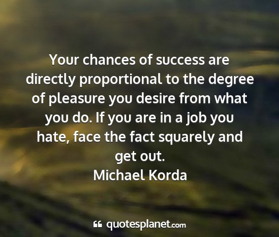 Your chances of success are directly proportional to the degree of pleasure you desire from what you do. If you are in a job you hate, face the fact squarely and get out.Michael Korda