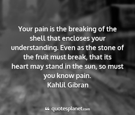 Your pain is the breaking of the shell that encloses your understanding. Even as the stone of the fruit must break, that its heart may stand in the sun, so must you know pain.Kahlil Gibran