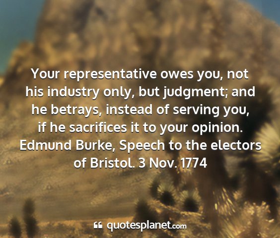 Your representative owes you, not his industry only, but judgment; and he betrays, instead of serving you, if he sacrifices it to your opinion.Edmund Burke, Speech to the electors of Bristol. 3 Nov. 1774