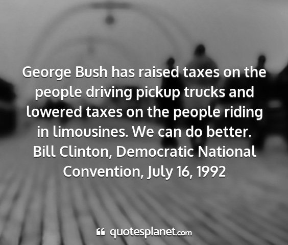 George Bush has raised taxes on the people driving pickup trucks and lowered taxes on the people riding in limousines. We can do better.Bill Clinton, Democratic National Convention, July 16, 1992