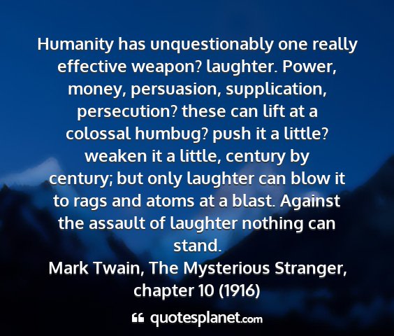 Humanity has unquestionably one really effective weapon? laughter. Power, money, persuasion, supplication, persecution? these can lift at a colossal humbug? push it a little? weaken it a little, century by century; but only laughter can blow it to rags and atoms at a blast. Against the assault of laughter nothing can stand.Mark Twain, The Mysterious Stranger, chapter 10 (1916)
