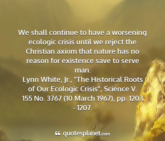 We shall continue to have a worsening ecologic crisis until we reject the Christian axiom that nature has no reason for existence save to serve man.Lynn White, Jr., "The Historical Roots of Our Ecologic Crisis", Science V. 155 No. 3767 (10 March 1967), pp. 1203 - 1207.
