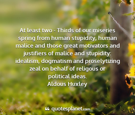 At least two - Thirds of our miseries spring from human stupidity, human malice and those great motivators and justifiers of malice and stupidity: idealism, dogmatism and proselytizing zeal on behalf of religous or political ideas.Aldous Huxley