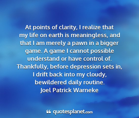 At points of clarity, I realize that my life on earth is meaningless, and that I am merely a pawn in a bigger game. A game I cannot possible understand or have control of. Thankfully, before depression sets in, I drift back into my cloudy, bewildered daily routine.Joel Patrick Warneke