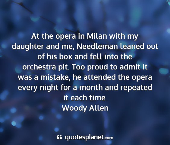 At the opera in Milan with my daughter and me, Needleman leaned out of his box and fell into the orchestra pit. Too proud to admit it was a mistake, he attended the opera every night for a month and repeated it each time.Woody Allen