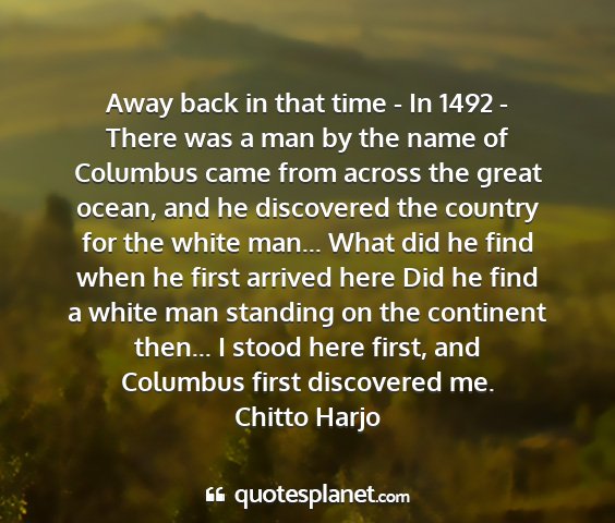 Away back in that time - In 1492 - There was a man by the name of Columbus came from across the great ocean, and he discovered the country for the white man... What did he find when he first arrived here Did he find a white man standing on the continent then... I stood here first, and Columbus first discovered me.Chitto Harjo