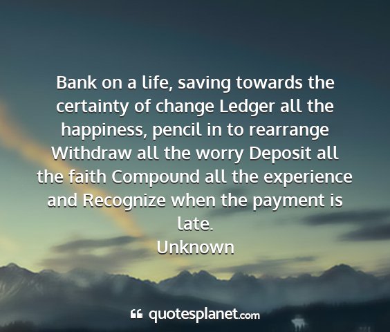Bank on a life, saving towards the certainty of change Ledger all the happiness, pencil in to rearrange Withdraw all the worry Deposit all the faith Compound all the experience and Recognize when the payment is late.Unknown