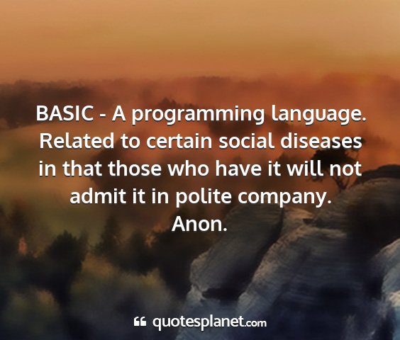 BASIC - A programming language. Related to certain social diseases in that those who have it will not admit it in polite company.Anon.