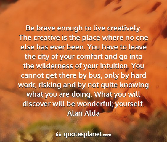 Be brave enough to live creatively. The creative is the place where no one else has ever been. You have to leave the city of your comfort and go into the wilderness of your intuition. You cannot get there by bus, only by hard work, risking and by not quite knowing what you are doing. What you will discover will be wonderful; yourself.Alan Alda