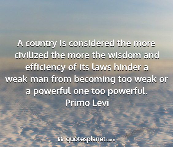 A country is considered the more civilized the more the wisdom and efficiency of its laws hinder a weak man from becoming too weak or a powerful one too powerful.Primo Levi