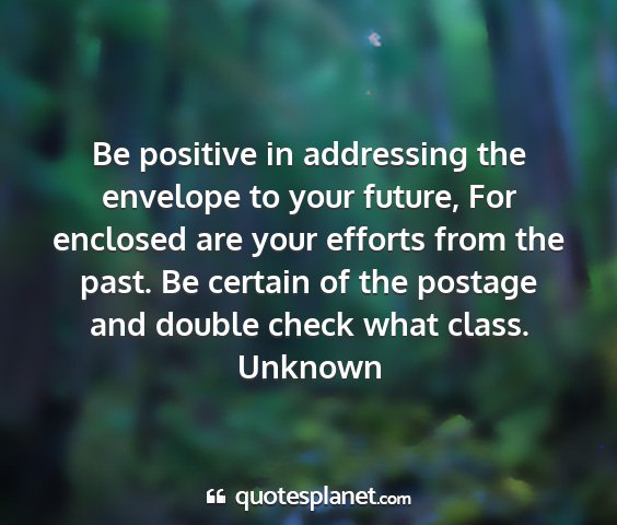 Be positive in addressing the envelope to your future, For enclosed are your efforts from the past. Be certain of the postage and double check what class.Unknown