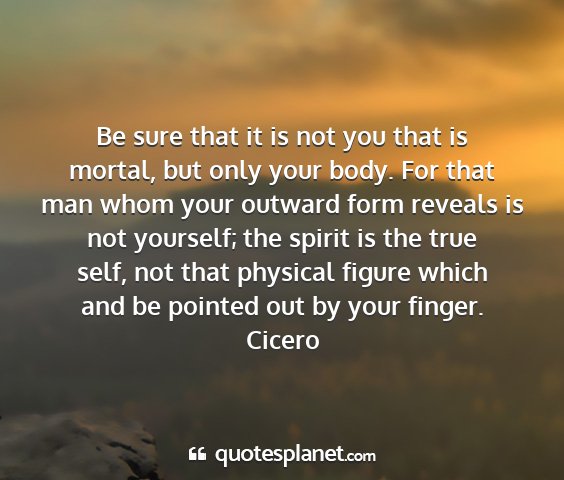 Be sure that it is not you that is mortal, but only your body. For that man whom your outward form reveals is not yourself; the spirit is the true self, not that physical figure which and be pointed out by your finger.Cicero