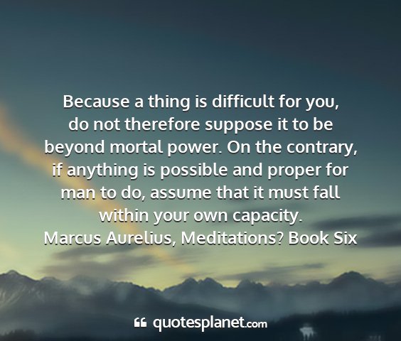 Because a thing is difficult for you, do not therefore suppose it to be beyond mortal power. On the contrary, if anything is possible and proper for man to do, assume that it must fall within your own capacity.Marcus Aurelius, Meditations? Book Six