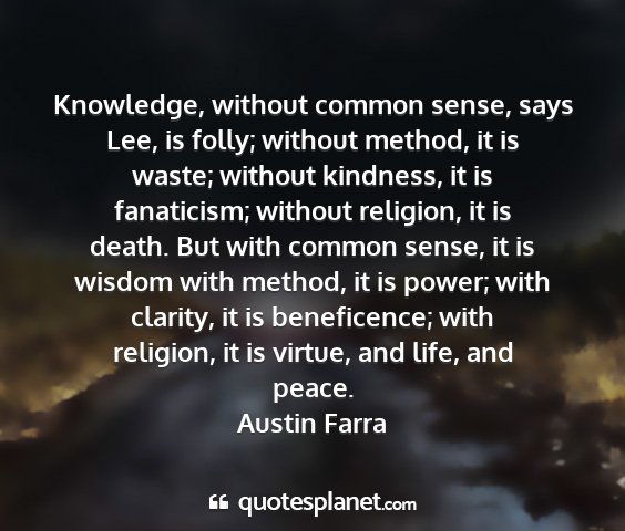 Knowledge, without common sense, says Lee, is folly; without method, it is waste; without kindness, it is fanaticism; without religion, it is death. But with common sense, it is wisdom with method, it is power; with clarity, it is beneficence; with religion, it is virtue, and life, and peace.Austin Farra