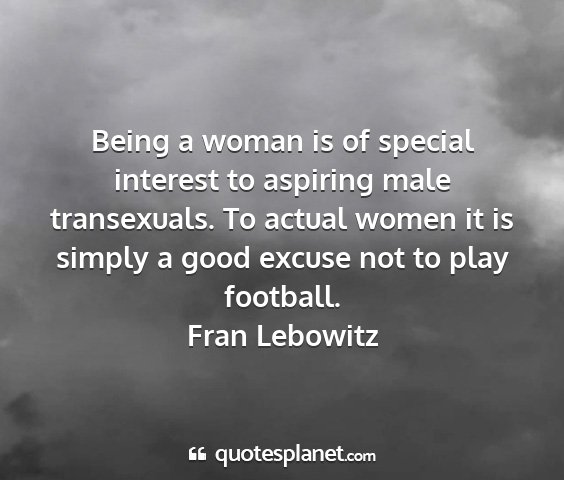 Being a woman is of special interest to aspiring male transexuals. To actual women it is simply a good excuse not to play football.Fran Lebowitz