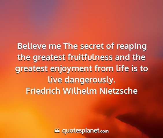 Believe me The secret of reaping the greatest fruitfulness and the greatest enjoyment from life is to live dangerously.Friedrich Wilhelm Nietzsche
