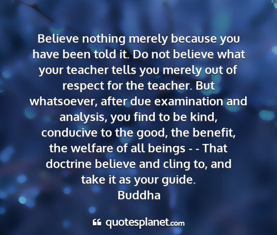 Believe nothing merely because you have been told it. Do not believe what your teacher tells you merely out of respect for the teacher. But whatsoever, after due examination and analysis, you find to be kind, conducive to the good, the benefit, the welfare of all beings - - That doctrine believe and cling to, and take it as your guide.Buddha