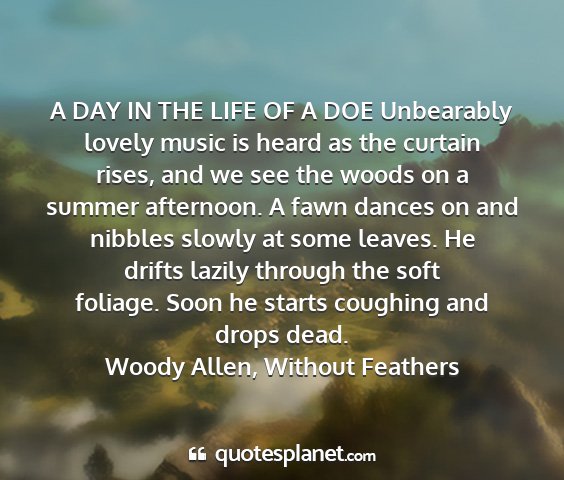 A DAY IN THE LIFE OF A DOE Unbearably lovely music is heard as the curtain rises, and we see the woods on a summer afternoon. A fawn dances on and nibbles slowly at some leaves. He drifts lazily through the soft foliage. Soon he starts coughing and drops dead.Woody Allen, Without Feathers