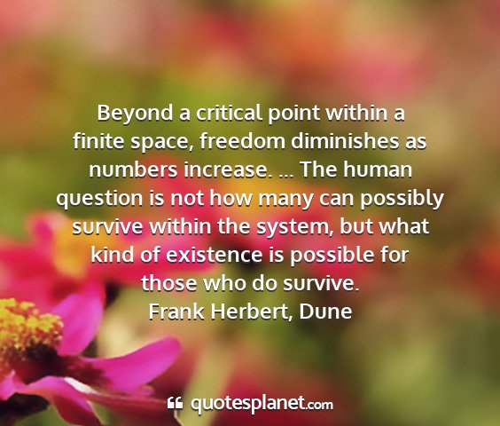 Beyond a critical point within a finite space, freedom diminishes as numbers increase. ... The human question is not how many can possibly survive within the system, but what kind of existence is possible for those who do survive.Frank Herbert, Dune