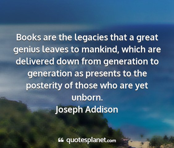 Books are the legacies that a great genius leaves to mankind, which are delivered down from generation to generation as presents to the posterity of those who are yet unborn.Joseph Addison