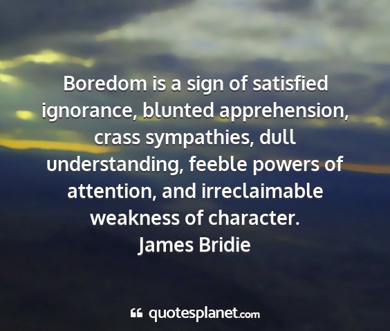 Boredom is a sign of satisfied ignorance, blunted apprehension, crass sympathies, dull understanding, feeble powers of attention, and irreclaimable weakness of character.James Bridie
