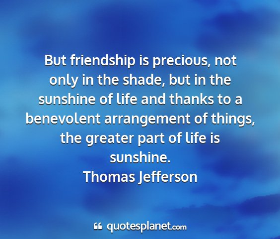 But friendship is precious, not only in the shade, but in the sunshine of life and thanks to a benevolent arrangement of things, the greater part of life is sunshine.Thomas Jefferson