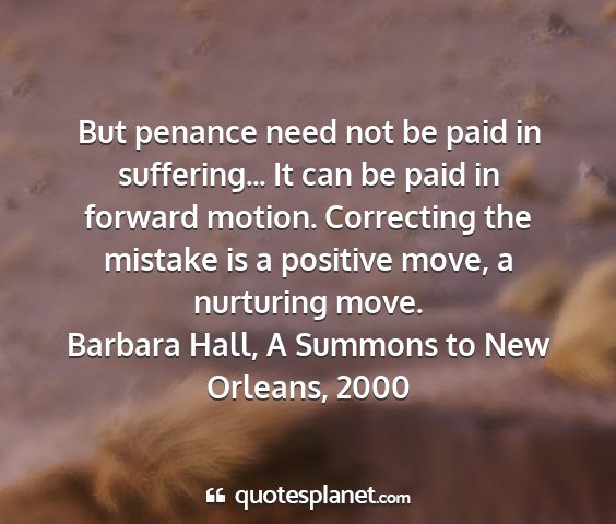 But penance need not be paid in suffering... It can be paid in forward motion. Correcting the mistake is a positive move, a nurturing move.Barbara Hall, A Summons to New Orleans, 2000