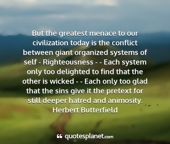 But the greatest menace to our civilization today is the conflict between giant organized systems of self - Righteousness - - Each system only too delighted to find that the other is wicked - - Each only too glad that the sins give it the pretext for still deeper hatred and animosity.Herbert Butterfield