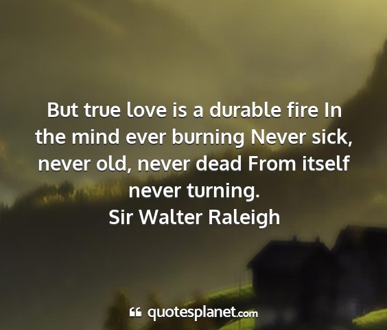 But true love is a durable fire In the mind ever burning Never sick, never old, never dead From itself never turning.Sir Walter Raleigh