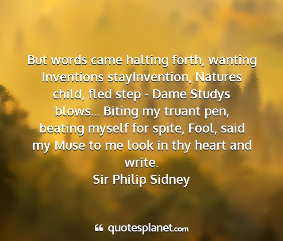 But words came halting forth, wanting Inventions stayInvention, Natures child, fled step - Dame Studys blows... Biting my truant pen, beating myself for spite, Fool, said my Muse to me look in thy heart and write.Sir Philip Sidney