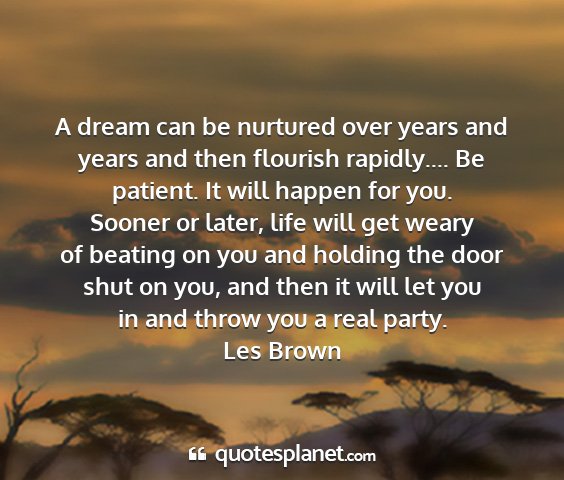 A dream can be nurtured over years and years and then flourish rapidly.... Be patient. It will happen for you. Sooner or later, life will get weary of beating on you and holding the door shut on you, and then it will let you in and throw you a real party.Les Brown